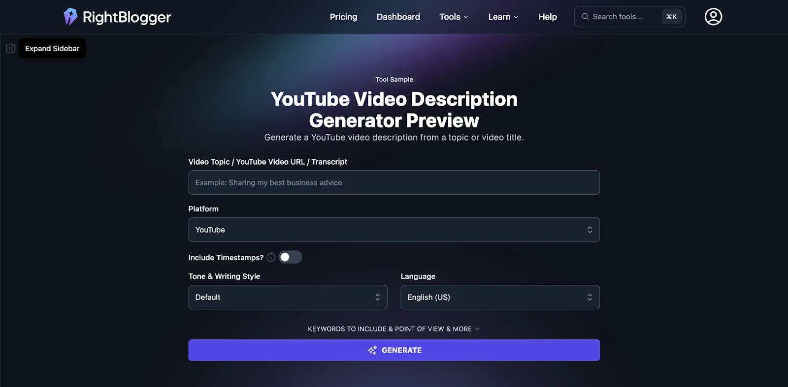 Here’s how you can use RightBlogger’s YouTube video description generator for free: