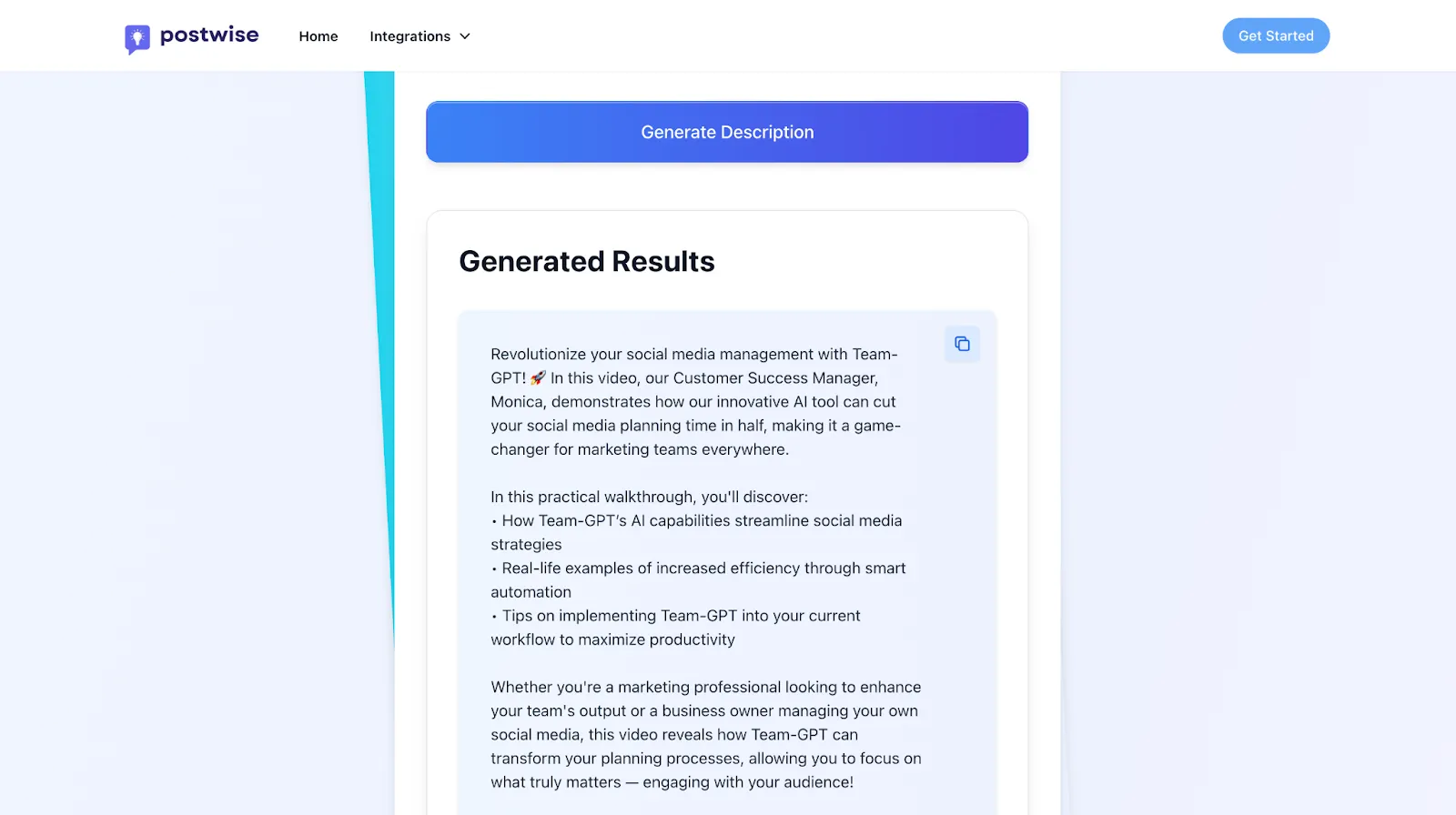 I tried generating a YouTube description for the Team-GPT video titled ‘How Team-GPT Cuts Social Media Planning Time in Half’ using Postwise’s YouTube Description Generator. The generated YouTube description looked like: