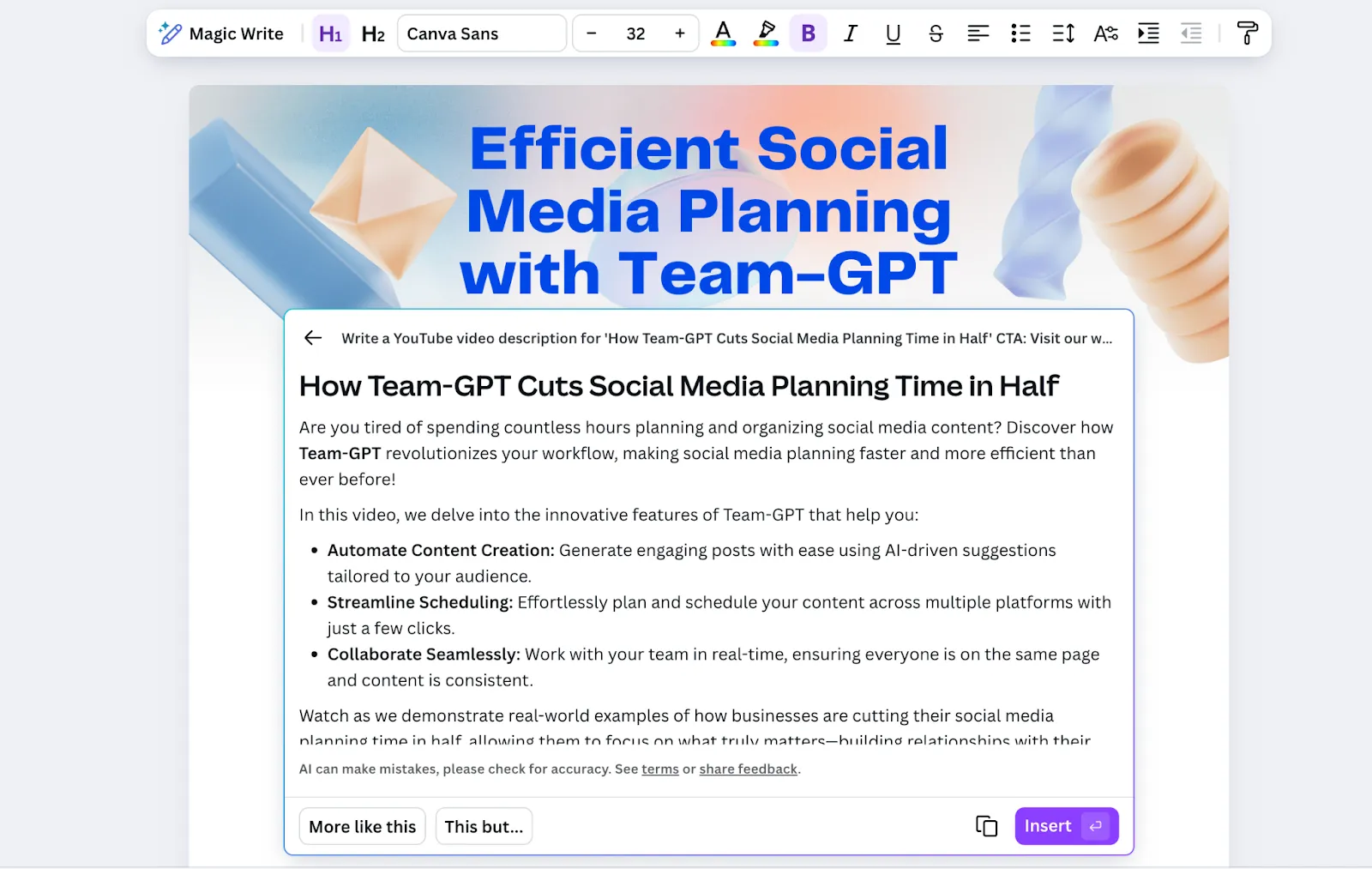 I tried to generate a YouTube description for the Team-GPT video titled ‘How Team-GPT Cuts Social Media Planning Time in Half’ using Canva’s YouTube Description Generator. Here’s the result: