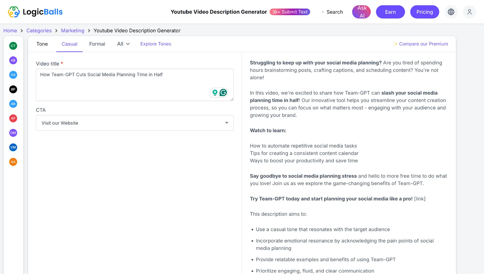 Here’s what LogicBalls gave me when I tried generating a YouTube description for the Team-GPT video titled ‘How Team-GPT Cuts Social Media Planning Time in Half:’