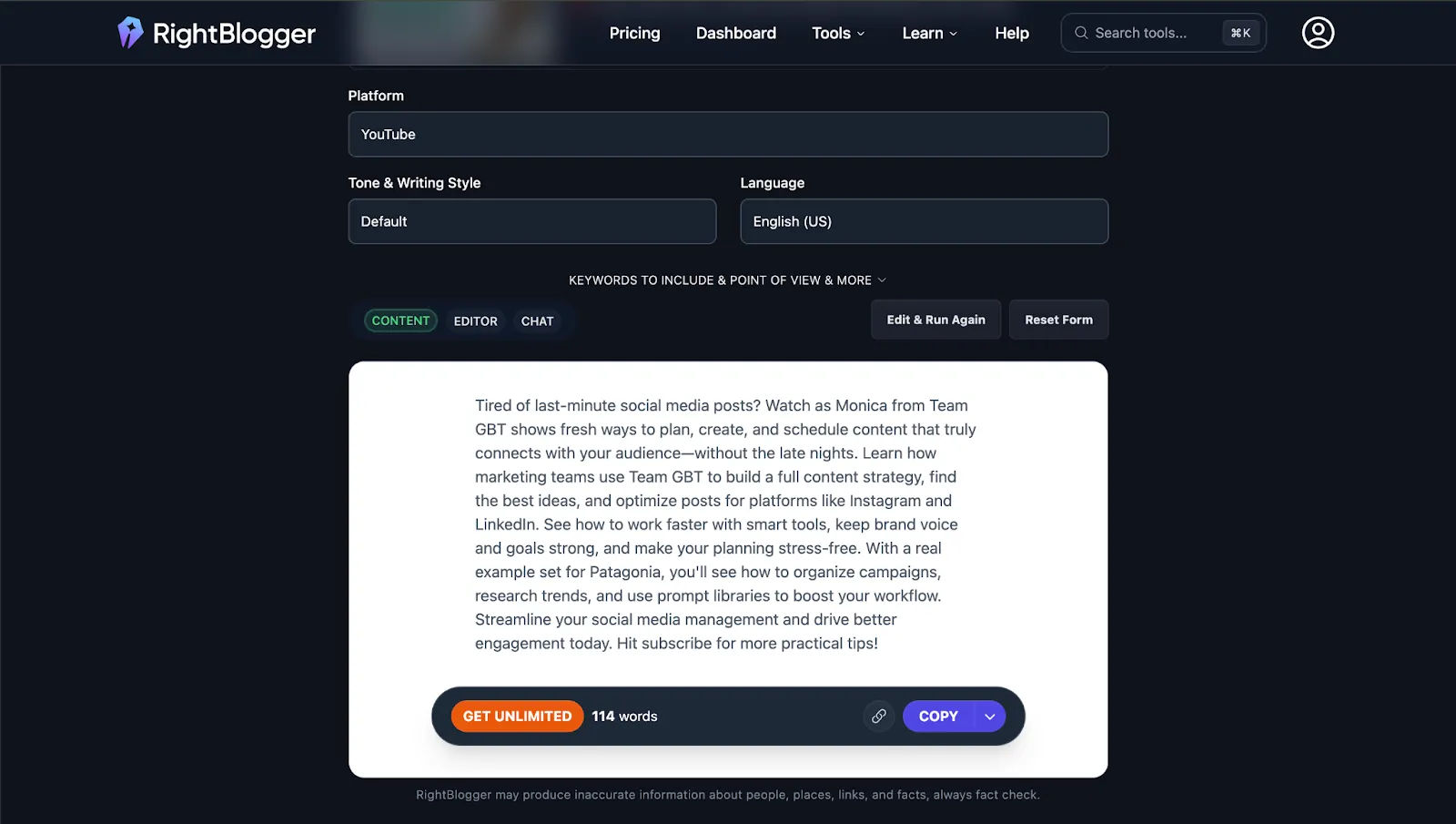 RightBlogger offers one of the most detailed and flexible YouTube description generators available in 2025. Whether you’re starting from a video title, a full transcript, or an existing YouTube URL, the tool creates SEO-friendly, brand-aligned descriptions in seconds.