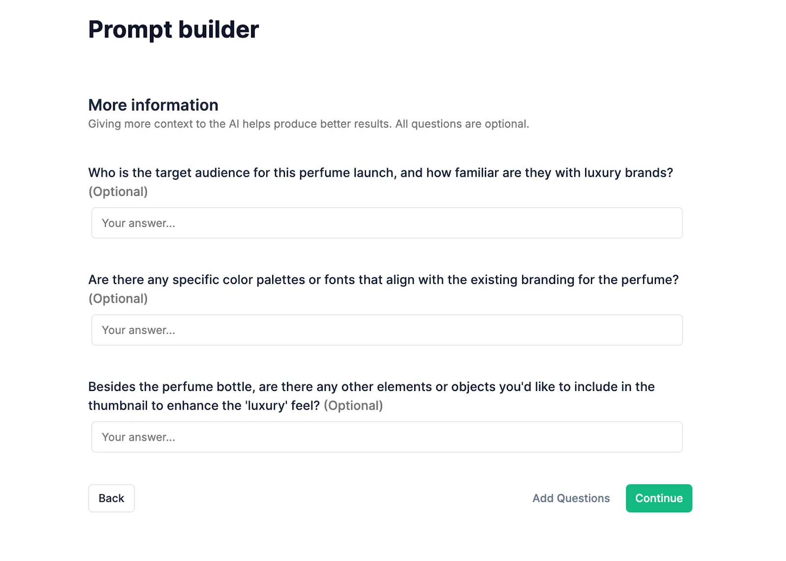 I answer those, and it generates a ready-to-use prompt I can use to generate a thumbnail.