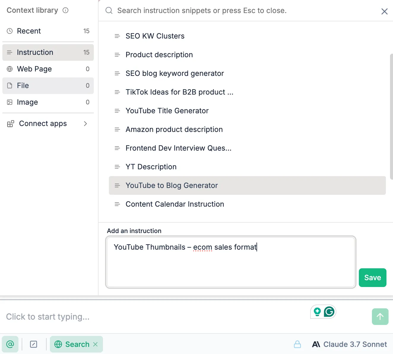 If I create thumbnails for similar videos—like weekly deal drops—I don’t want to rebuild prompts every time. So I create custom instructions.