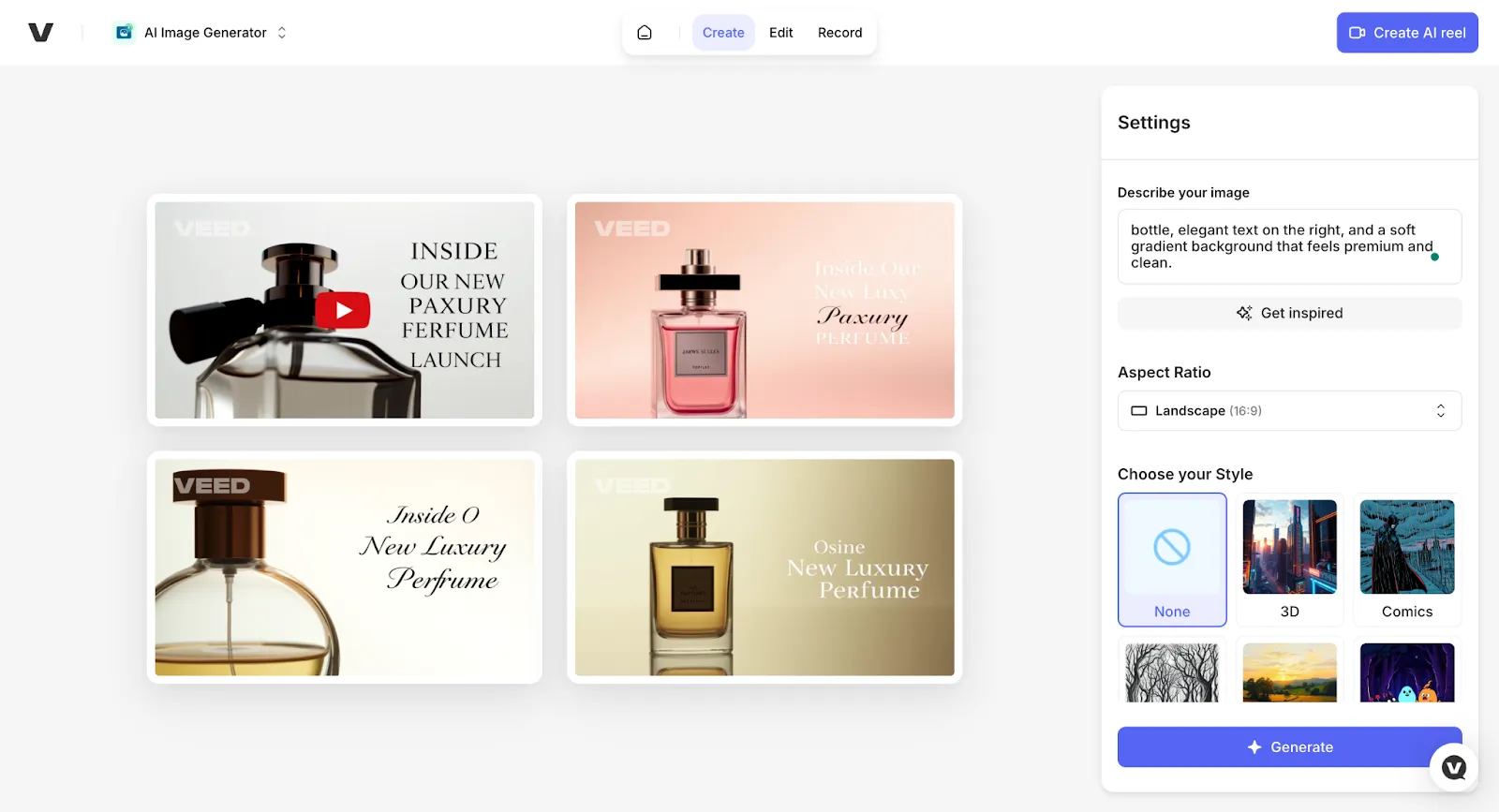 - Generate and Refine: VEED’s AI generates a few thumbnail options based on my prompt. If I want a different look, I tweak the prompt or try a new style until I find one that matches what I’m looking for.