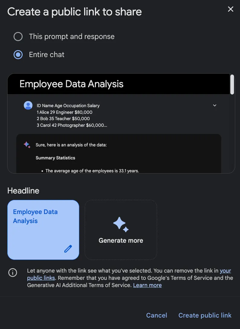 Bard also lets you share chats. It lets you choose if you want to share just a specific prompt or the entire chat, generates an AI title, and creates a public link to share.