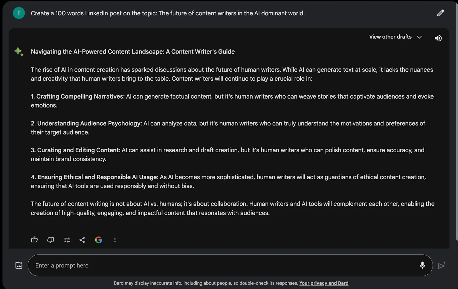 Although the post will require a human touch and comprehensive editing, it’s a good first draft compared to Bard’s. 👇
