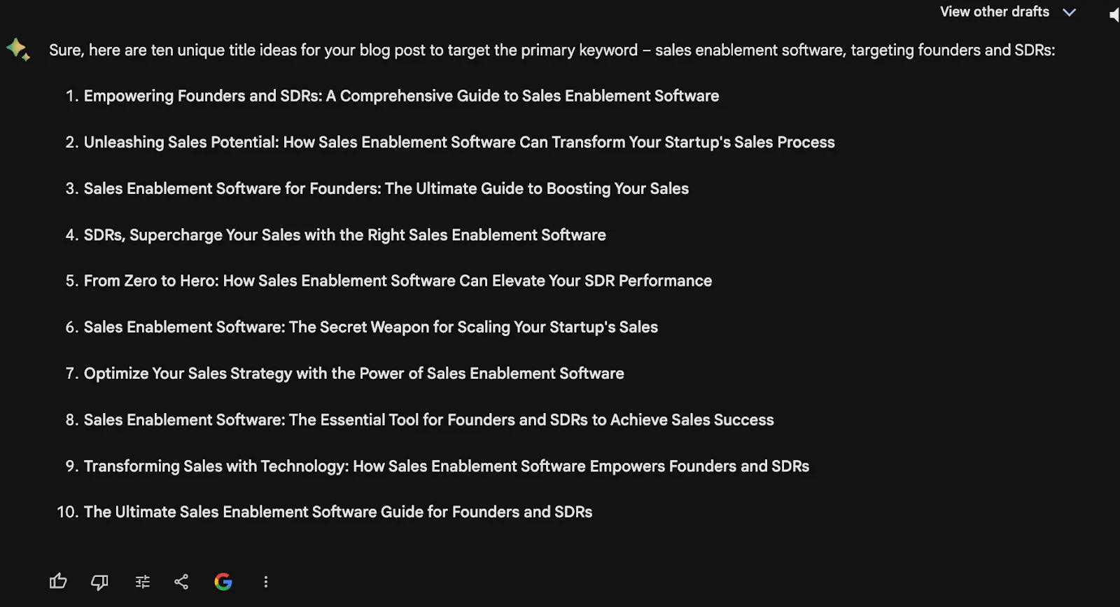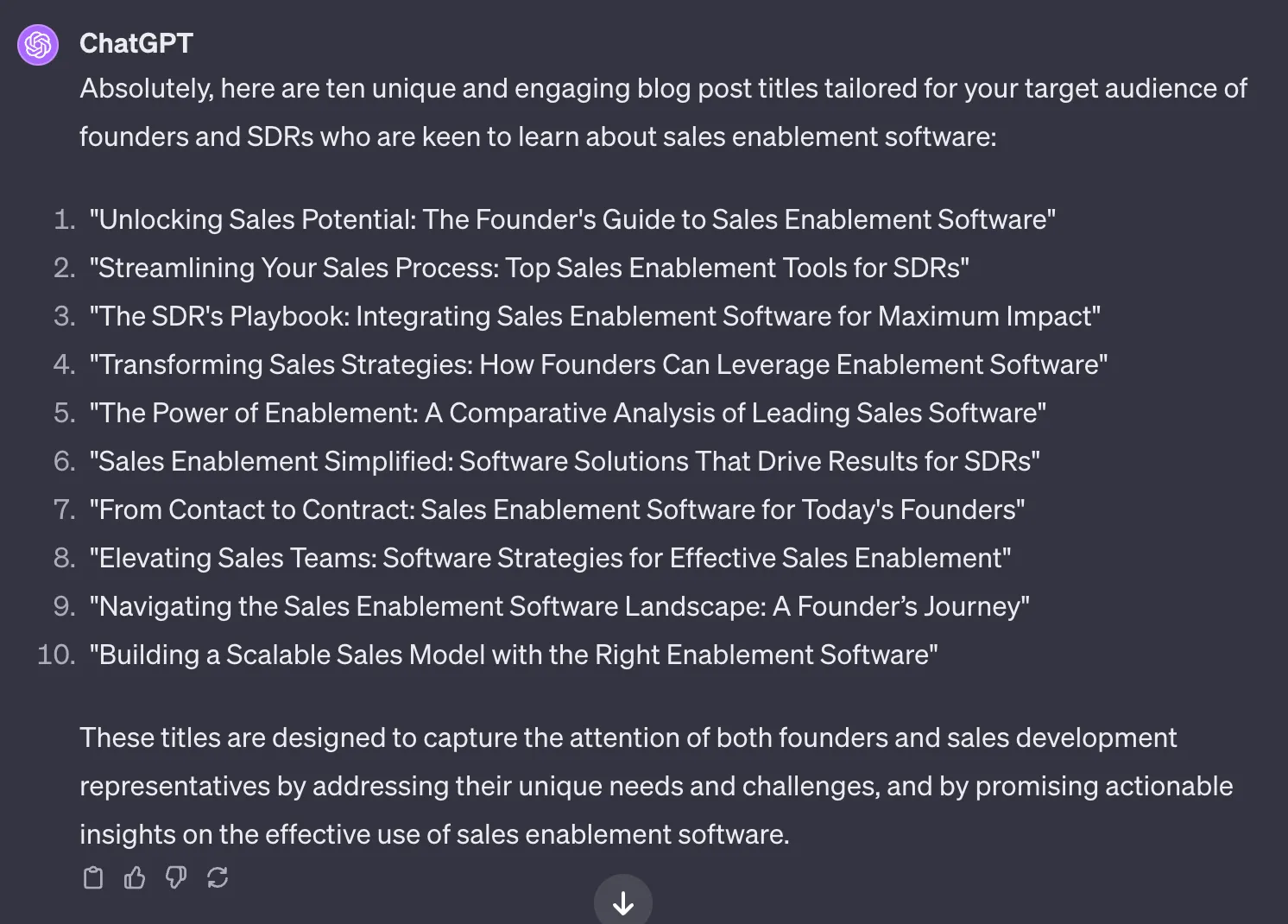 Goal: Generate ten unique title ideas for my blog post to target the primary keyword – sales enablement software.