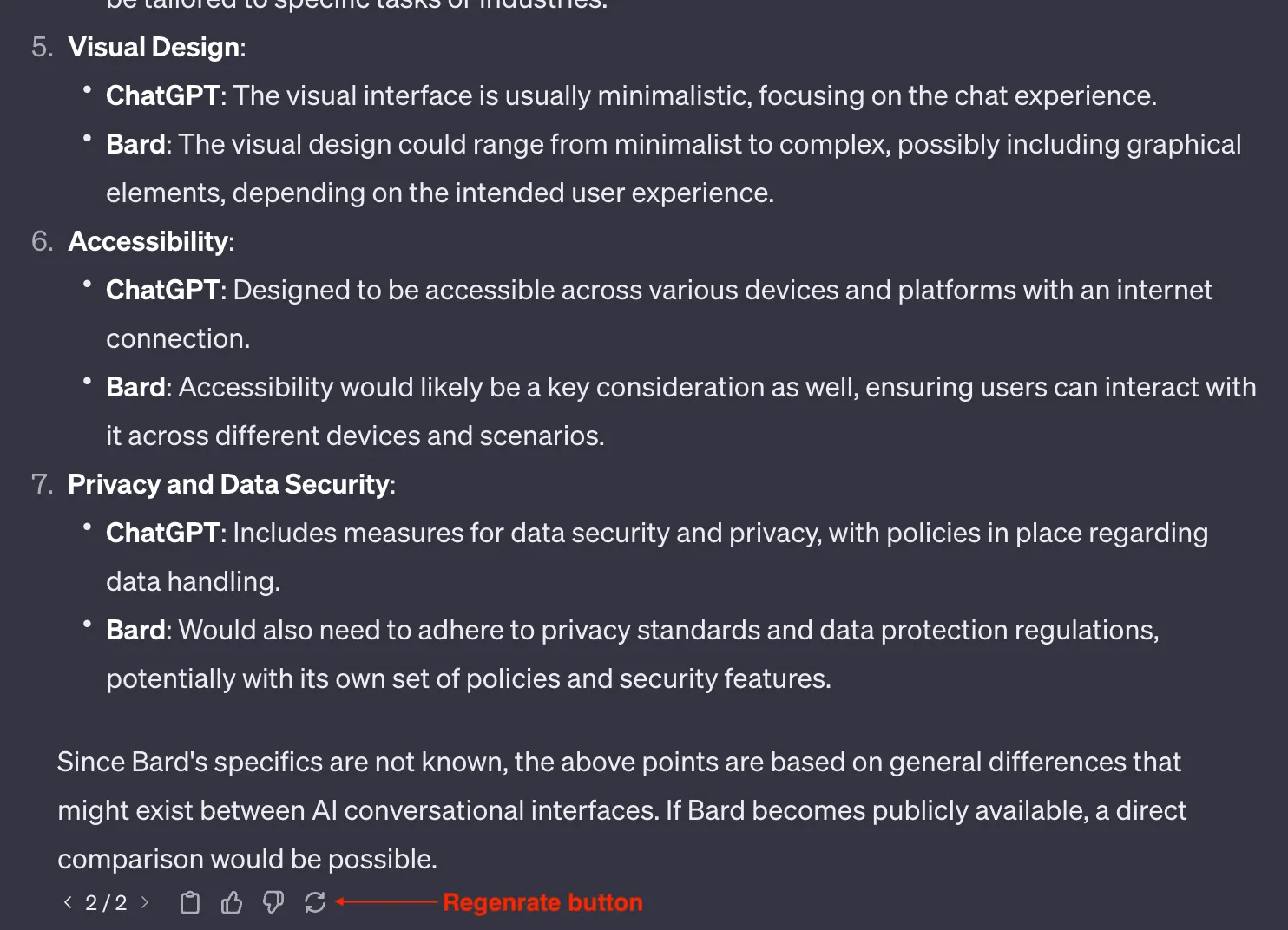 - Quick action: Bard and ChatGPT let you copy answers to the clipboard, like/dislike the replies, or regenerate the answer with a single click.