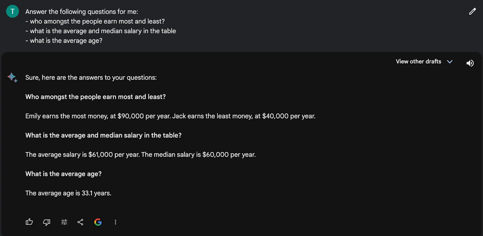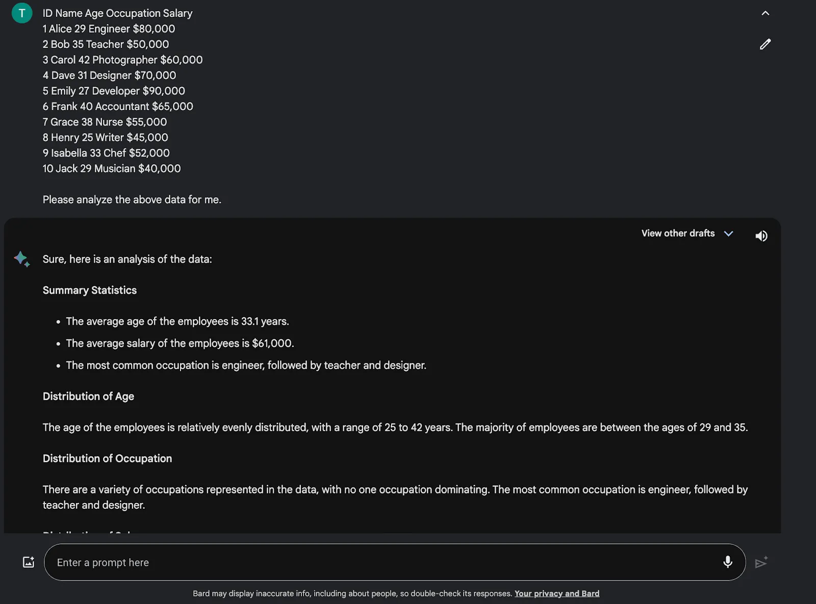 It analyzed the data quickly, but there were some flaws. For example, Bard told me – ‘The most common occupation is engineer, followed by teacher and designer.’ But the table just has one entry from each profession. Meaning there were no common professions.