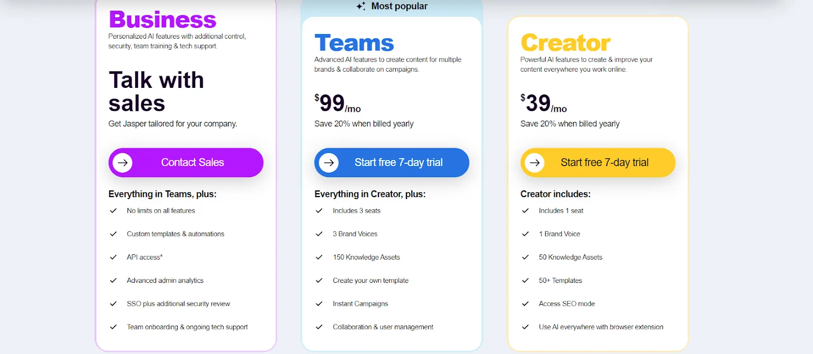 There are three Jasper.ai plans to choose from: