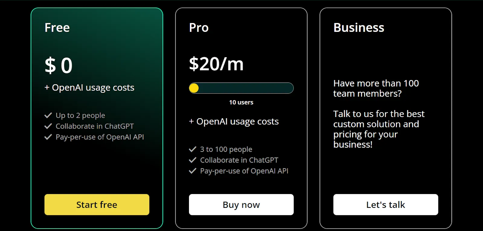 Team-GPT offers three pricing plans: Free, Pro, and Business.