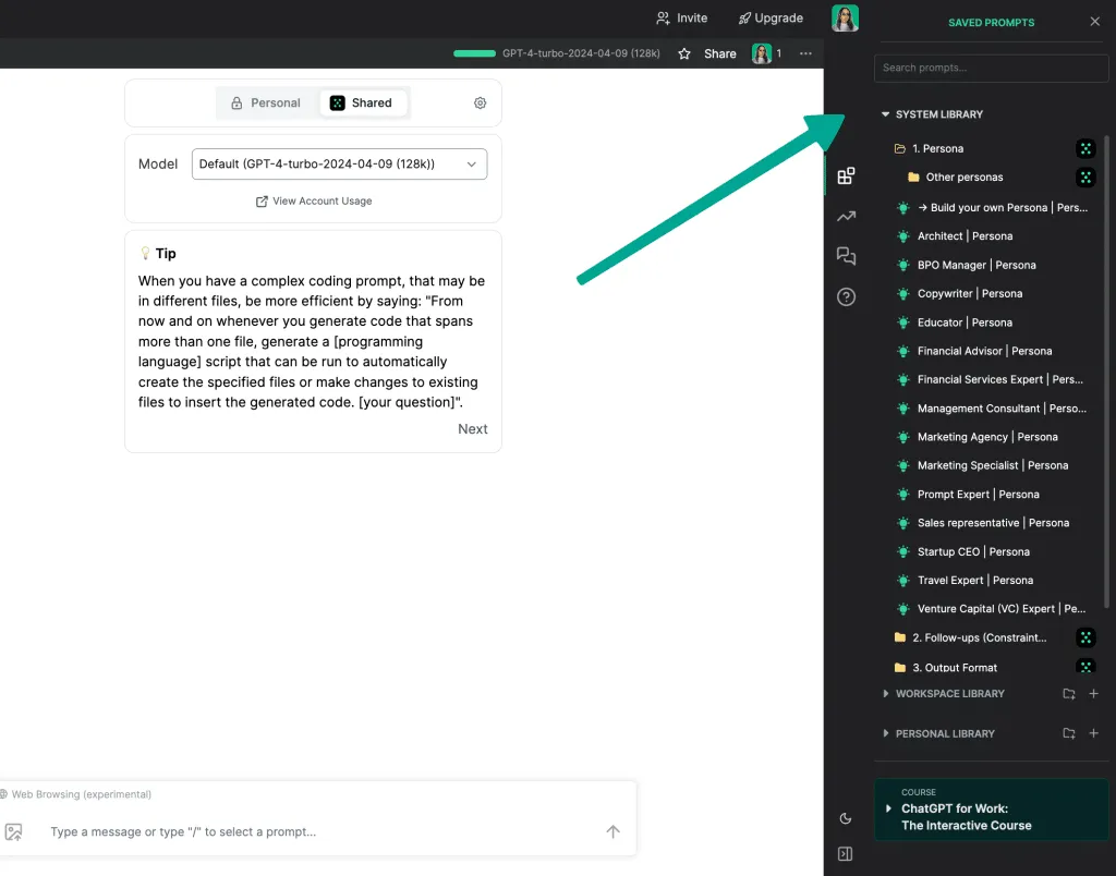 In Team-GPT, you can find a system library of 100+ prompt templates and personas to quickly get the AI into the role that matches your project or task objectives.