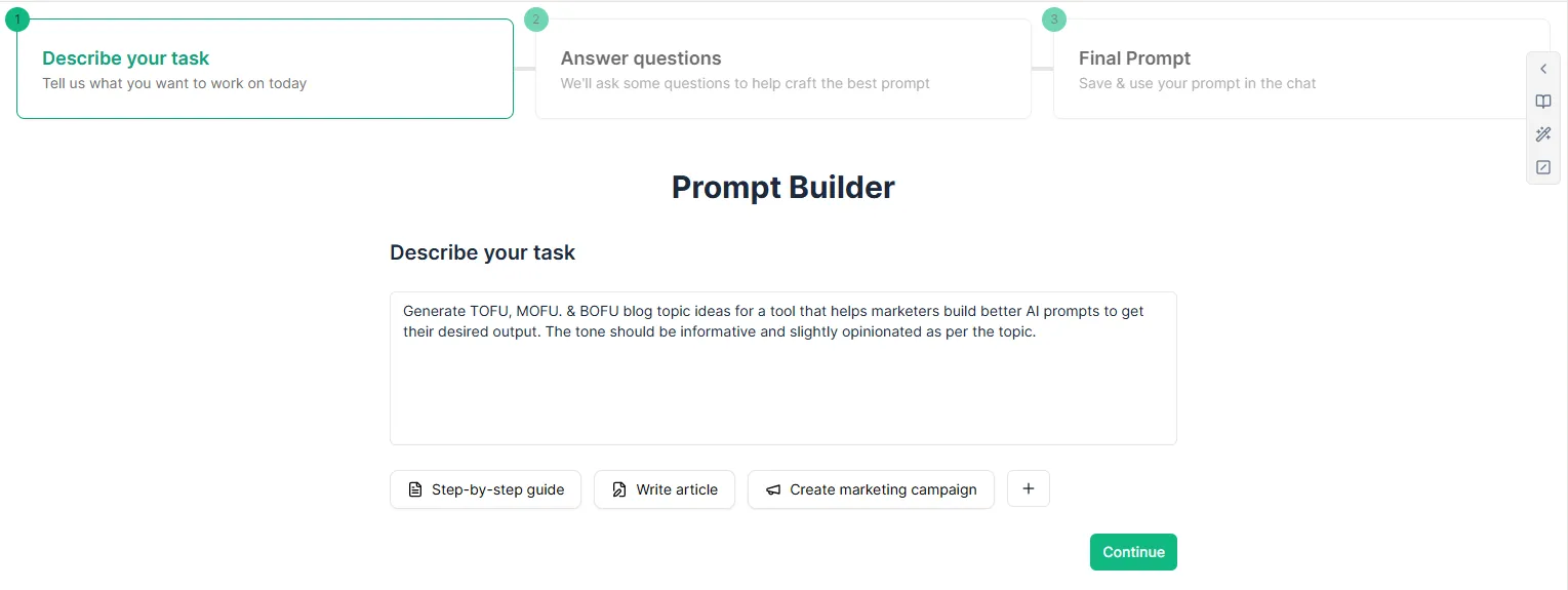 The way the tool works is simple: I describe my blog goals inside the Prompt Builder, answer a few guided questions, and get a prompt that details my exact requirement to make sure the output is good.