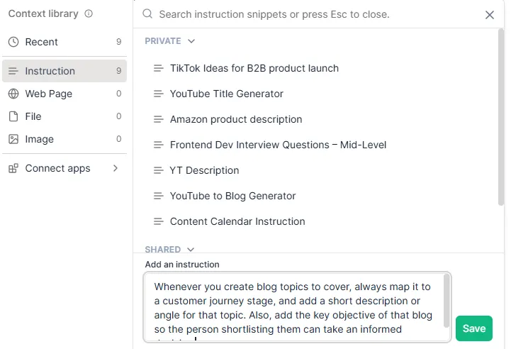 The steps to add an instruction are: Click “Add Context” > “Instruction” > “Enter your instruction” > “Save” > name it (example – “Blog Post Idea Generator”). Now this can be made public and used by anybody!