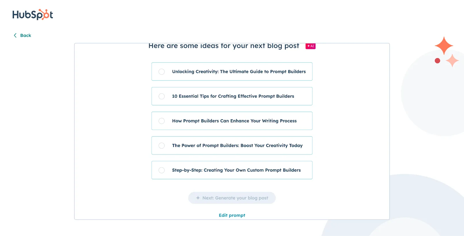I used the same keyword “prompt builders” to generate blog topic ideas with HubSpot’s tool. Here are some examples it gave me: