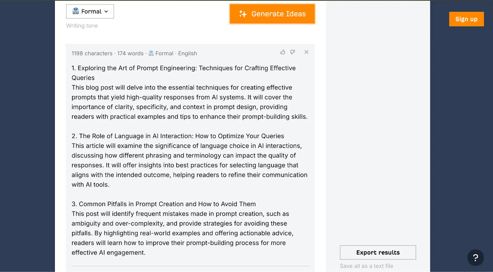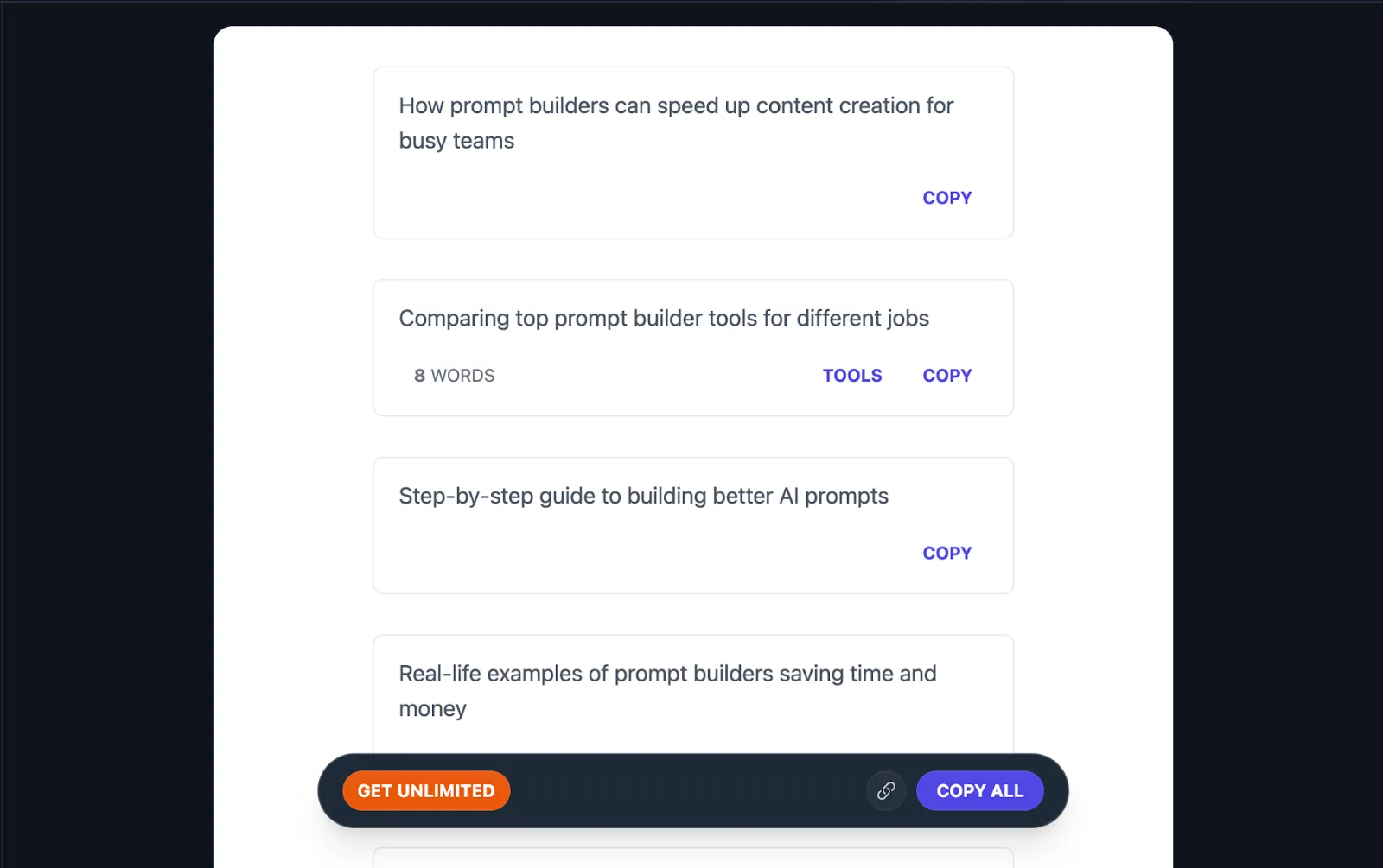 I’ll be using the keyword “prompt builders” to generate blog post ideas with RyRob’s tool. Here are some of the results it gave me: