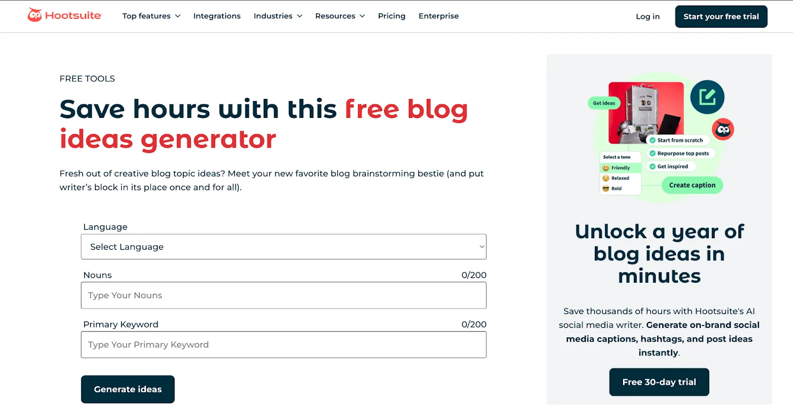 Hootsuite’s blog ideas generator is a fast and beginner-friendly tool that helps you come up with fresh blog post topics. Whether you’re out of ideas or planning a blog calendar, you can use this free tool to generate relevant blog titles with just a few inputs.