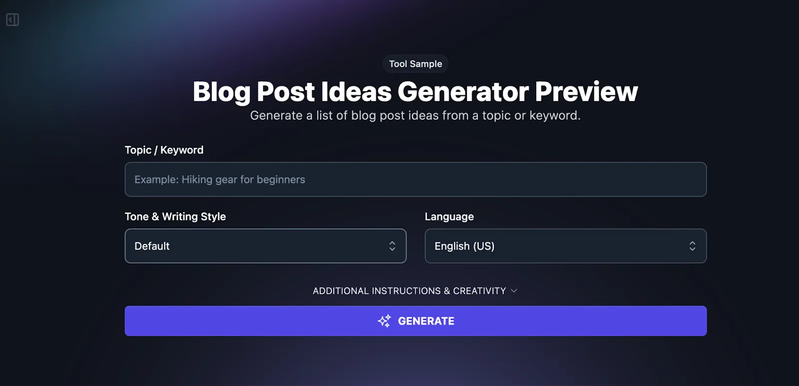 Best for: Bloggers, SEO writers, and content marketers who want fast, SEO-friendly blog post ideas with minimal input.