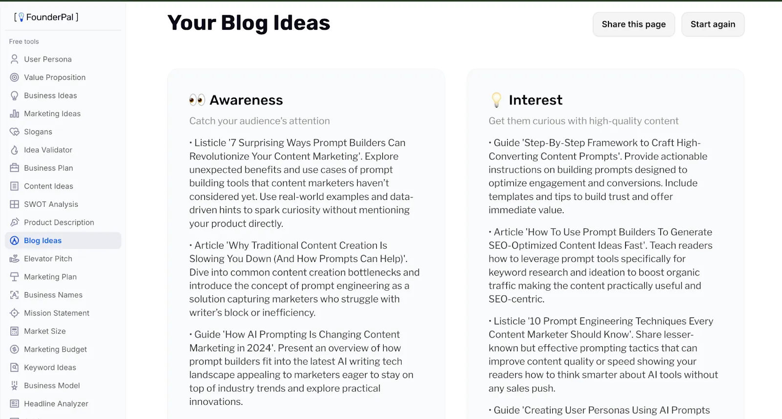 I used the same keyword “prompt builders” to generate blog ideas using FounderPal. Here are the results: