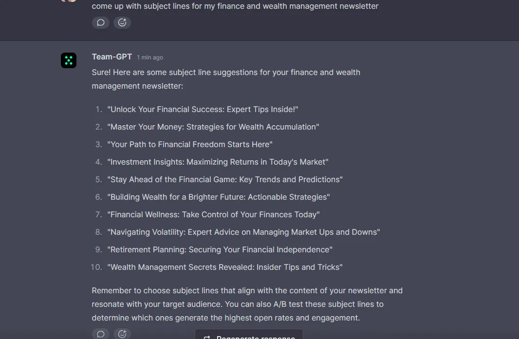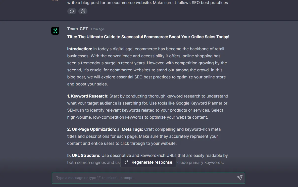 Here’s the final output that I was provided by Team-GPT after I provided it with my prompt: