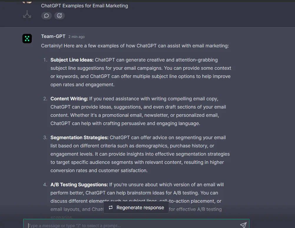 Are you looking for a trustworthy writing assistant for your email marketing? ChatGPT is an excellent fit for all your email campaigns and outreaches. Some use cases it can be helpful in are generating creative ideas for subject lines, writing content, developing segmentation strategies, providing suggestions for A/B testing, etc.