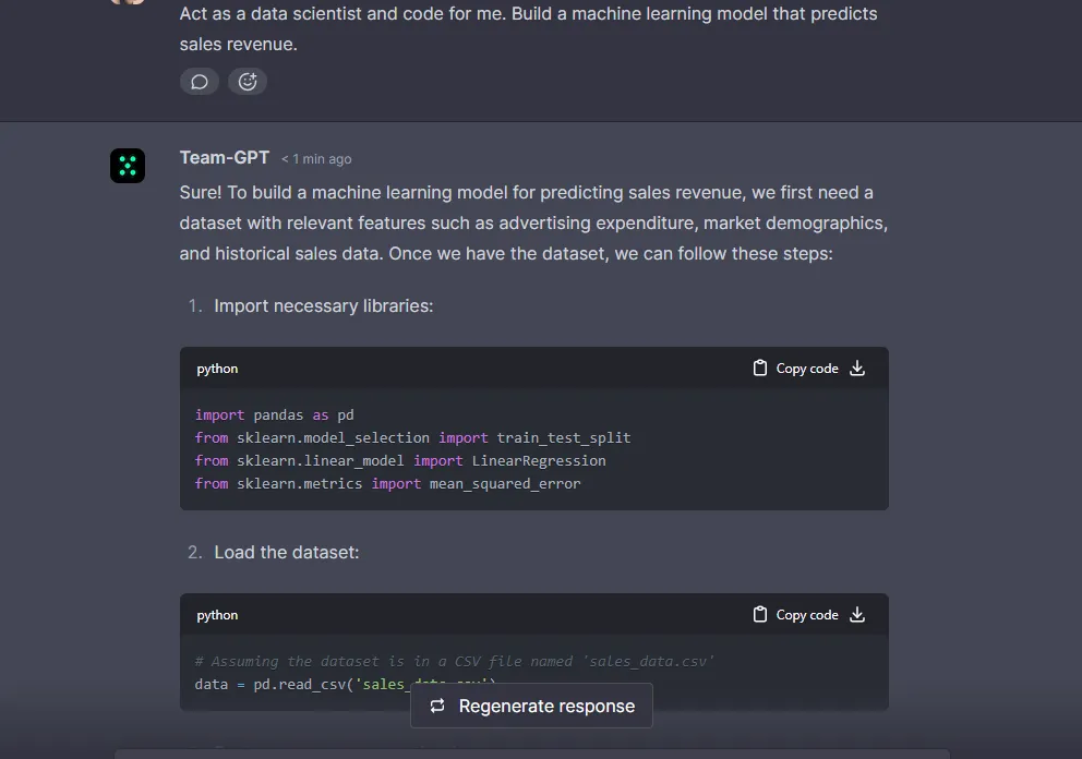 ChatGPT can provide code snippets to build your machine-learning model, which you can use to predict business sales revenue based on datasets.