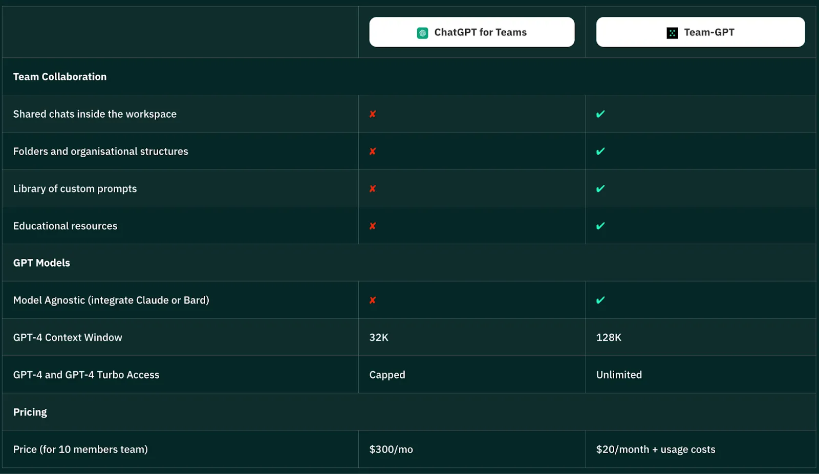 Here are the three key differences that make Team-GPT a better AI adopter platform: