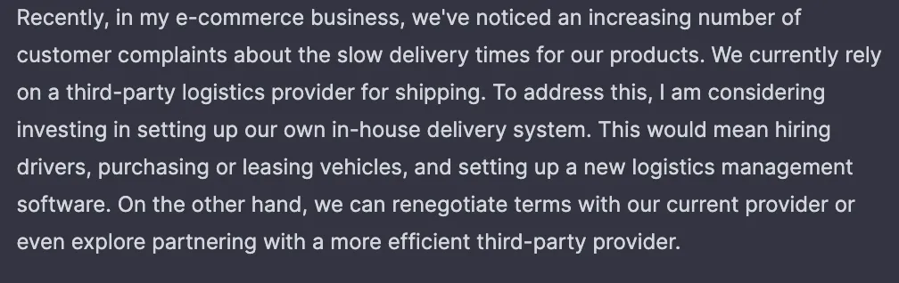 ChatGPT can help you resolve complex business scenarios quickly. ChatGPT is trained on Large Language Models (LLMs), so you can ask it to gather insights, take a step-by-step approach to decide, or weigh the pros and cons of a specific situation.