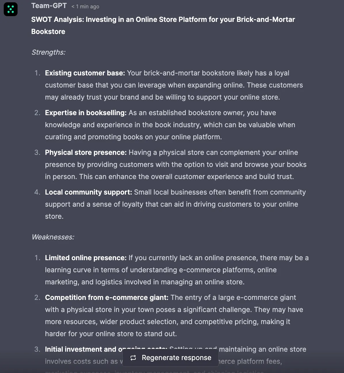 Goal: Using the SWOT analysis framework, help me evaluate the decision to invest in an online store platform for my brick-and-mortar bookstore, especially in light of the upcoming competition from the e-commerce giant opening a physical store in my town.