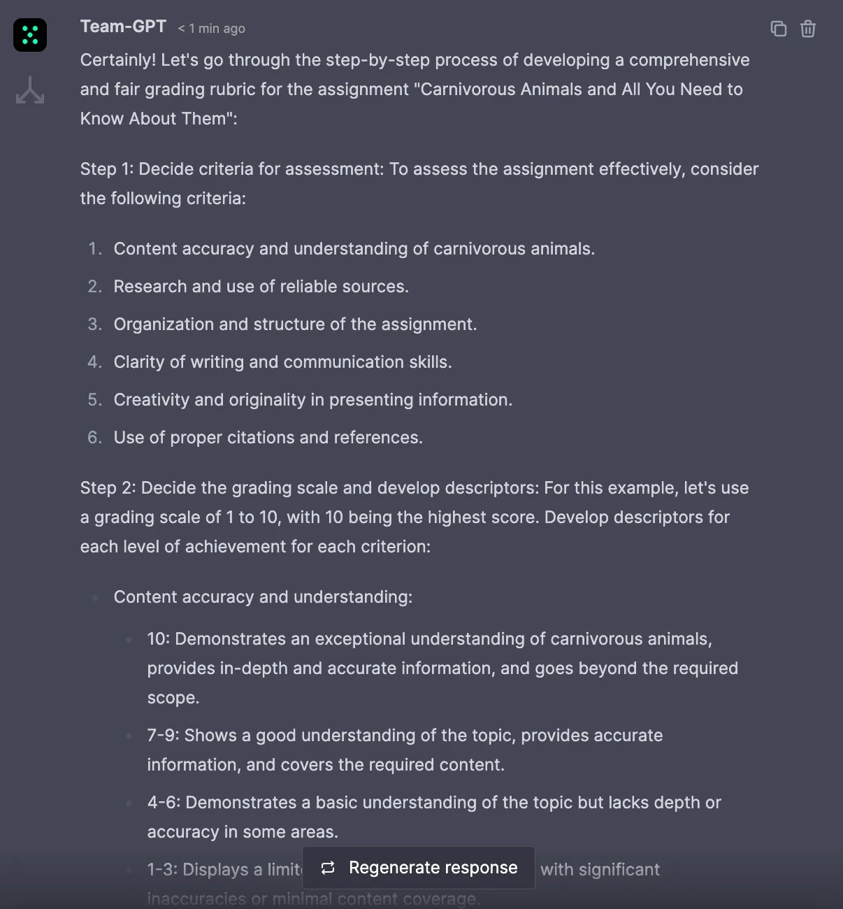 ChatGPT can help you set clear and objective criteria for grading assignments, projects, and exams. You can ask the AI to generate rubric templates and leverage them to grade all student assignments and save a significant amount of time.