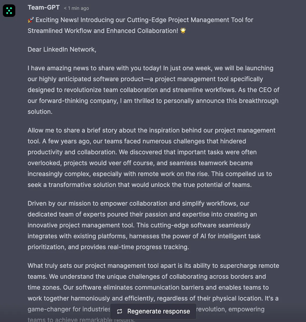 ChatGPT helps you craft posts with a professional tone suitable for LinkedIn, ensuring your content resonates with a business-oriented audience.