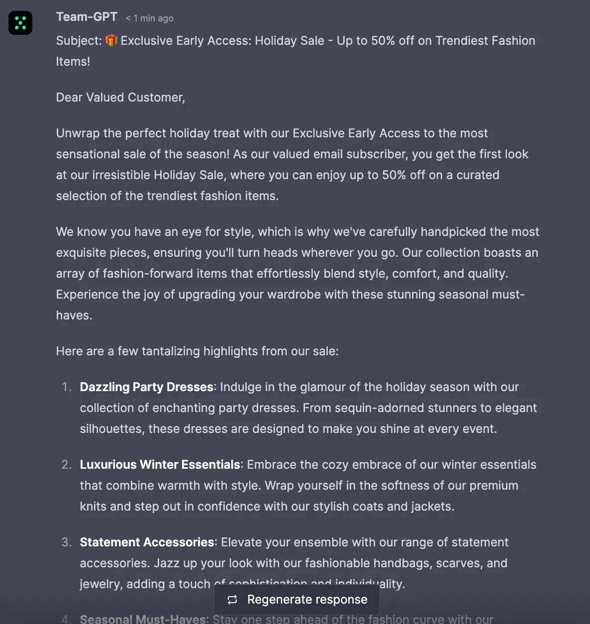 All in all, using ChatGPT for your holiday sale email announcement can enhance the effectiveness, creativity, and efficiency of your communication, contributing to the success of your sale.