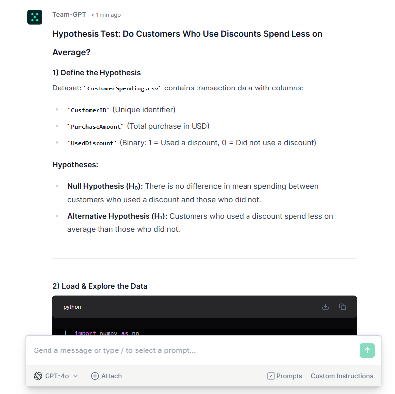 ChatGPT helped me conduct a hypothesis test to determine whether customers who used discounts spent less on average.