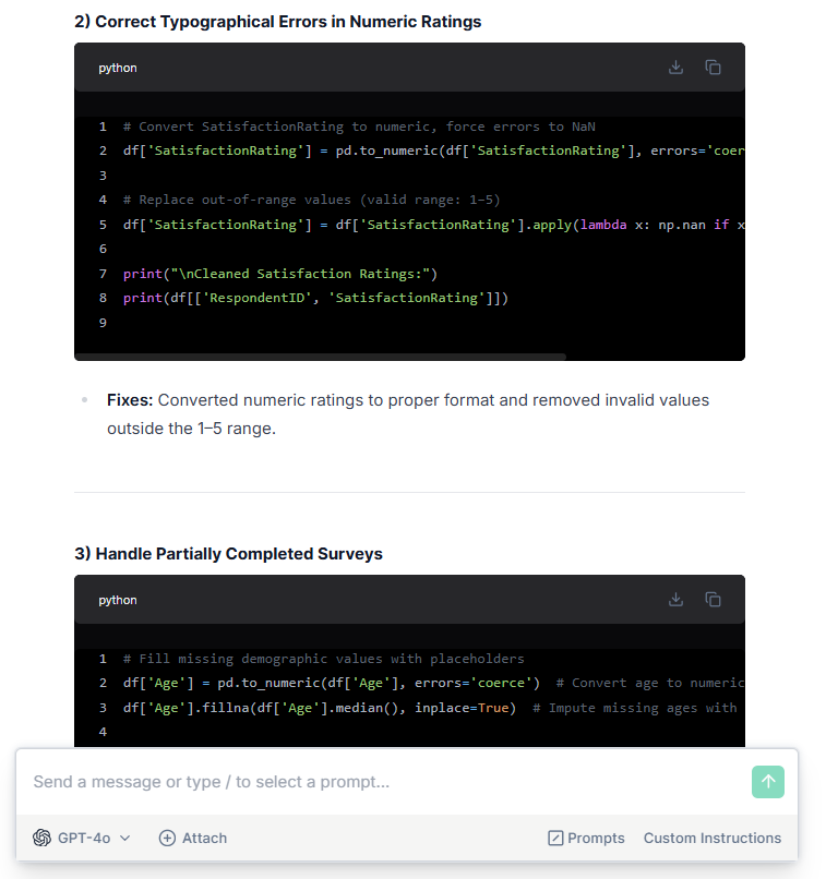 Prompt: “I’m trying to consolidate survey results (satisfaction ratings, open-ended responses, and demographic info) gathered through different platforms. Some of the demographic questions were optional, so many users have partial responses. Some numeric ratings include typographical errors. I want you to consolidate and clean the data, correcting typos, and ensuring that the final dataset has no errors.’’