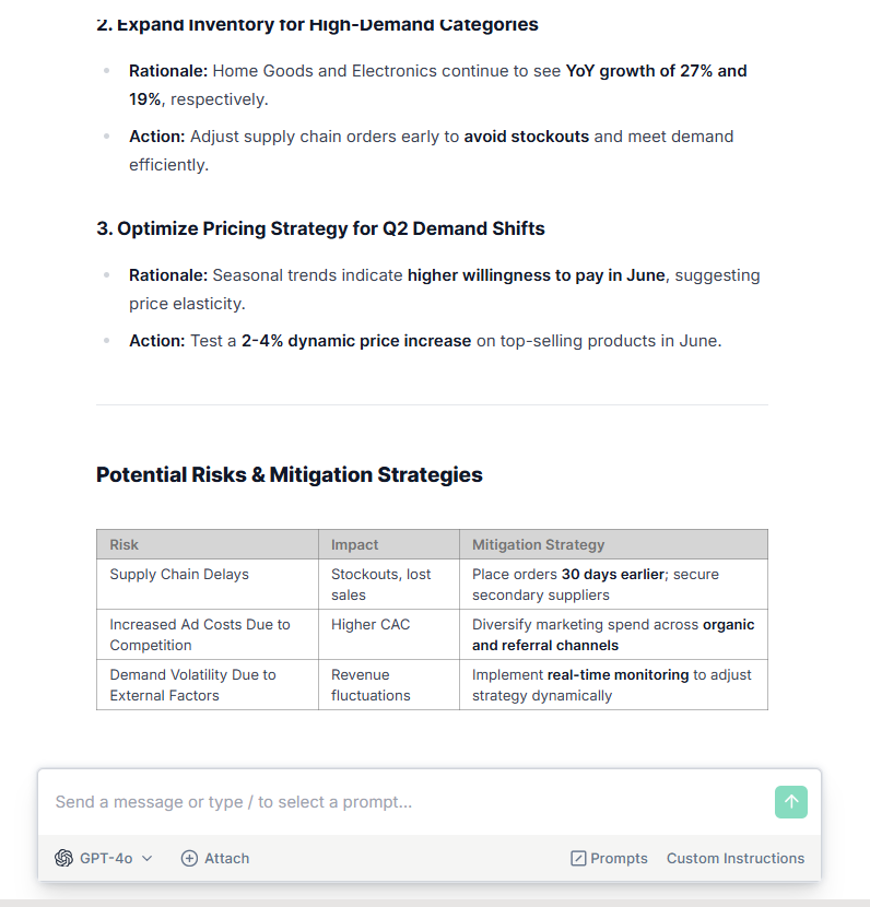 Why this is useful: Such prompts can help you develop a data-driven strategy to capitalize on seasonal trends and to help you mitigate operational risks, such as placing orders 30 days earlier and securing secondary suppliers to reduce stockouts and lost sales.