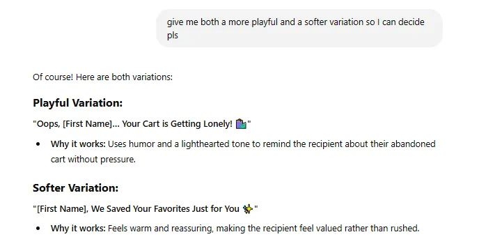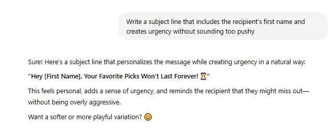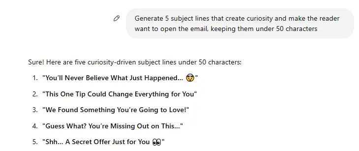 - Generate multiple subject line variations – Use AI to create different styles (e.g., curiosity-driven, question-based, urgency-focused).