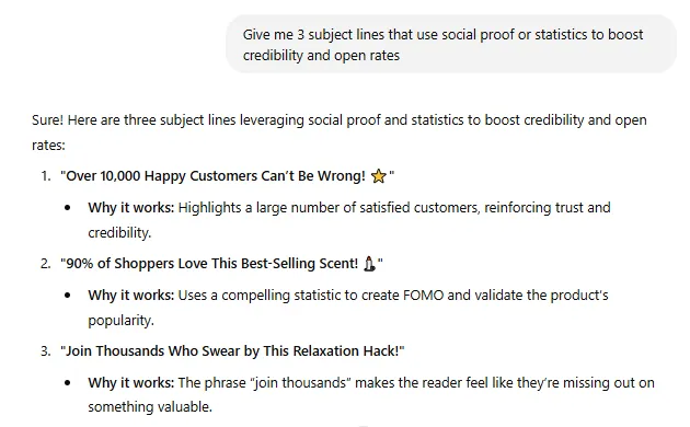 3. Give me 3 subject lines that use social proof or statistics to boost credibility and open rates
