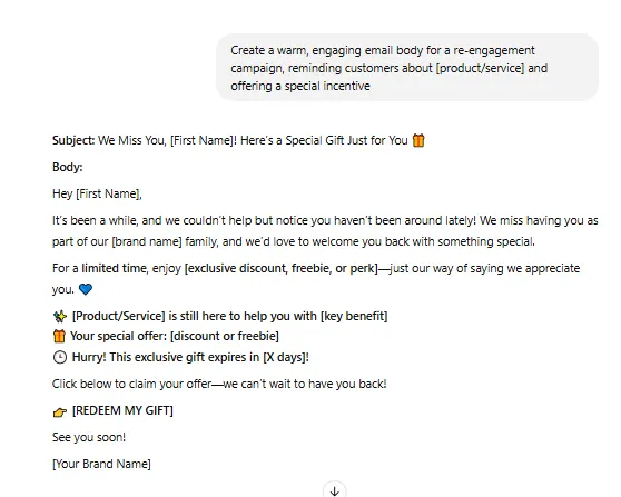 How to customize: Personalize the tone based on past interactions—for a VIP customer, add appreciation (“We miss you, [First Name]!”), while for a cold lead, focus on curiosity or a new offer (“Something new just for you!”).