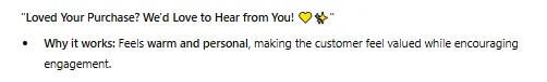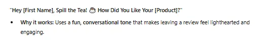How to customize: Personalize it based on purchase type (“Tell Us What You Think” for general use or “Help Fellow Shoppers—Share Your Thoughts” for community-driven brands). For example, if your brand tone of voice is more lighthearted and friendly, you can use an even more casual version, such as: