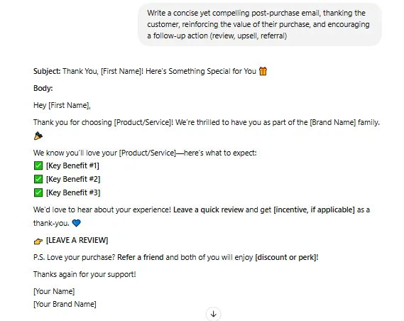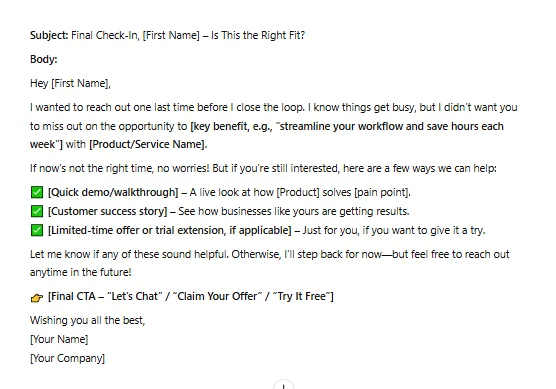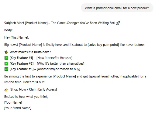 - Keeping formatting consistent – Ensure AI-generated emails follow your usual format, whether that’s short paragraphs, bullet points, or bold CTA buttons.