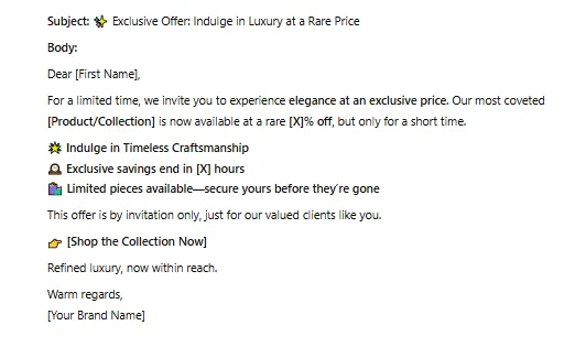 How to customize: Adjust the tone (playful, luxury, minimalistic) and the offer type (percentage off, free shipping, bundle deals). For example, a promotional email for luxury goods could look like this: