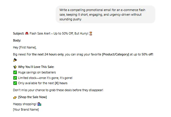 ✅ “Write a high-converting promotional email for an e-commerce flash sale.”