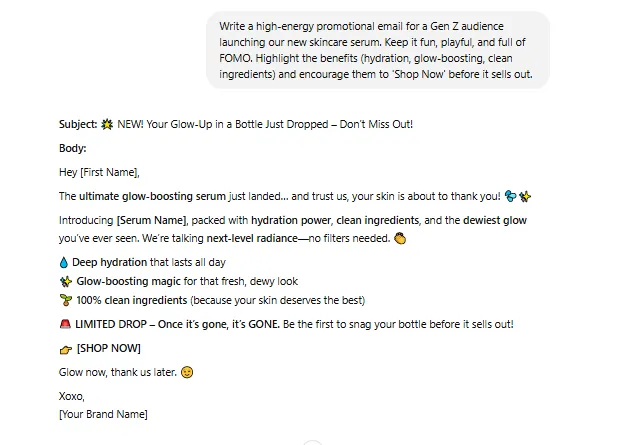 ✅ “Write a high-energy promotional email for a Gen Z audience launching our new skincare serum. Keep it fun, playful, and full of FOMO. Highlight the benefits (hydration, glow-boosting, clean ingredients) and encourage them to ‘Shop Now’ before it sells out.”