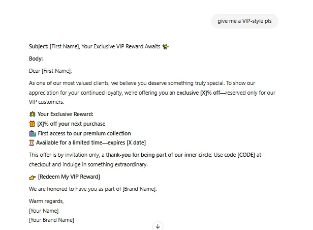 - “You’re an expert in luxury branding, crafting high-end email marketing copy for premium fashion brands.”