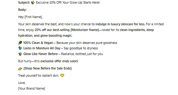 “Act as an experienced e-commerce email marketer. Write a high-converting promotional email for a limited-time 20% off sale on our luxury skincare brand’s best-selling moisturizer. The audience is beauty-conscious millennials who value clean ingredients and glowing skin. The tone should be elegant yet playful, emphasizing exclusivity and a sense of urgency. CTA: ‘Shop Now Before the Sale Ends!'”