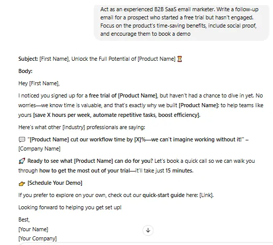 ✅ “Act as an experienced B2B SaaS email marketer. Write a follow-up email for a prospect who started a free trial but hasn’t engaged. Focus on the product’s time-saving benefits, include social proof, and encourage them to book a demo.”