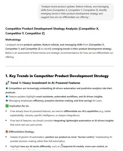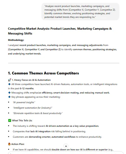 Why it works: Leading competitors often set market trends. This prompt helps you spot common strategic moves across competitors, revealing the direction the industry is headed.