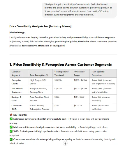 - “You’re an experienced pricing strategist. Compare [Industry Name] competitors and identify underpriced or overpriced market segments.”