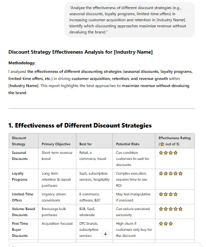 - “Compare pricing strategies across the top five competitors in [Industry Name] and suggest gaps we could leverage.”