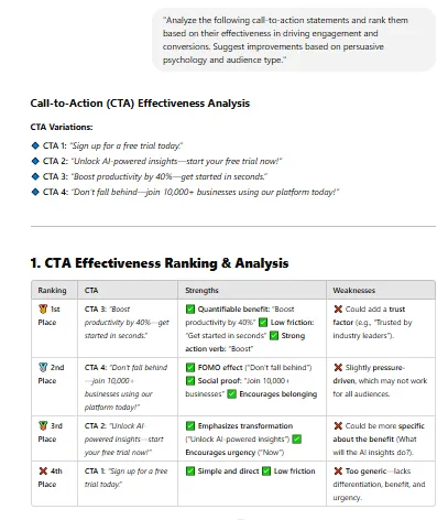 Why it works: It helps refine CTA language to maximize conversions and identifies whether a CTA is action-driven, passive, or unclear.